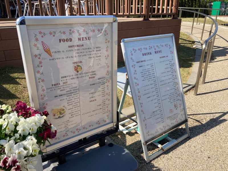 花の城ゾーンに行く前に、芝生広場にあったベンチでお昼を食べました。