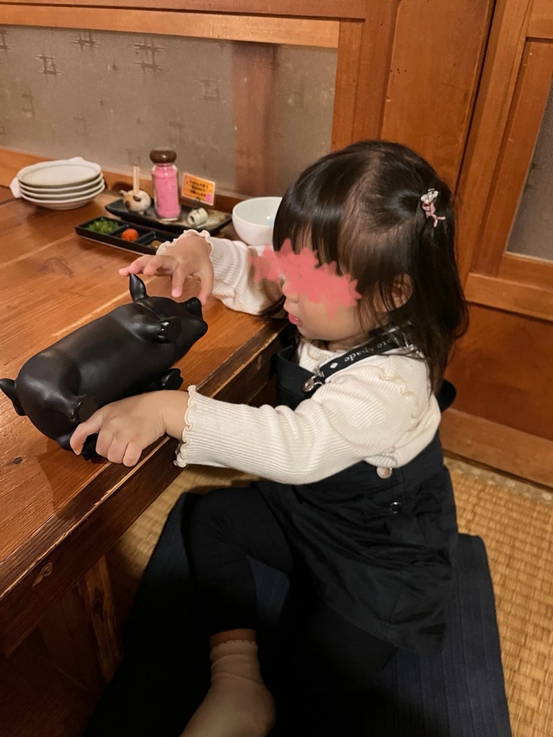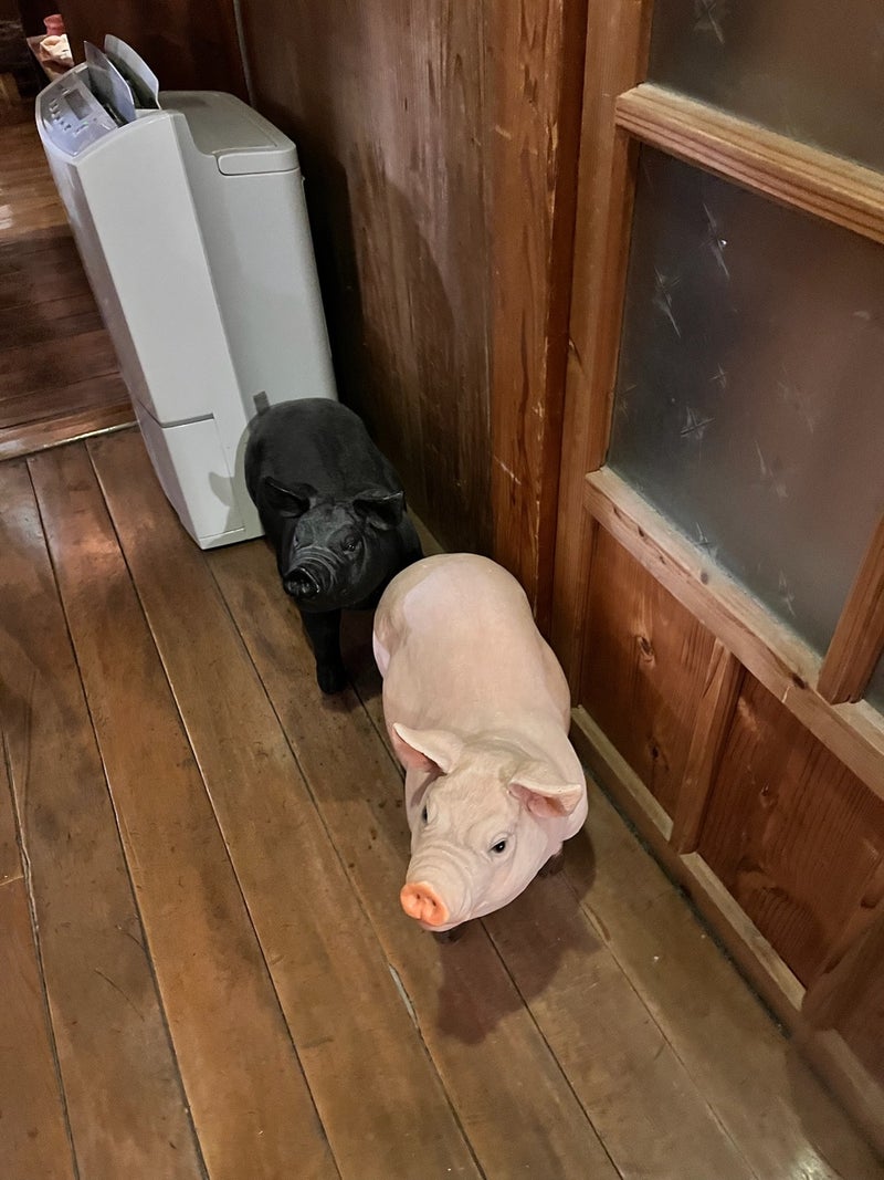 店員さんを呼びたいときは、下記写真の黒豚を押して「ぶひぶひ」鳴らします。この鳴き声が絶妙に本物の豚の鳴き声にそっくりで、色んな所で鳴るたびに笑ってしまいました。