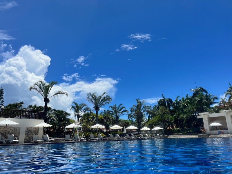 紺碧の海を表現したディープブルーが美しいメインプール。琉球石灰岩のエントランスやプールサイドに並ぶ真っ白なパラソルとビーチベッドがリゾート感を盛り上げます。