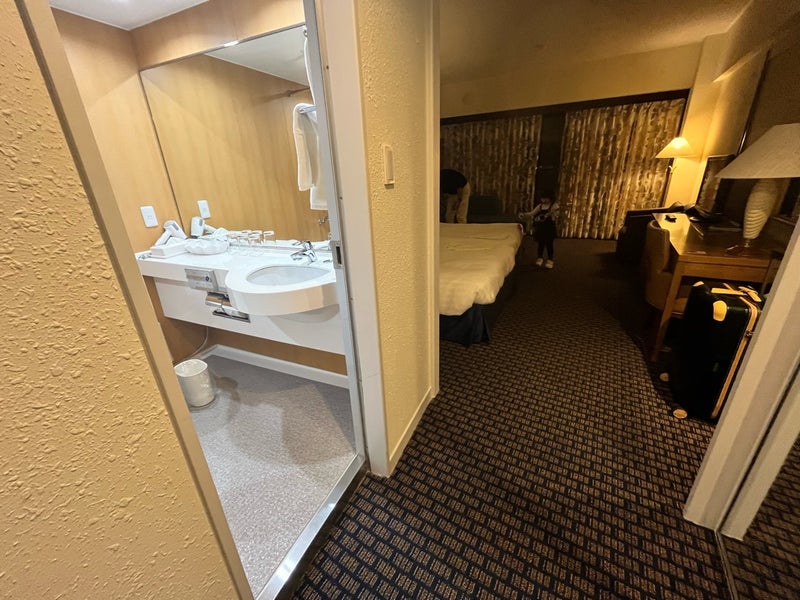 部屋のドアを開けると、左手にお風呂と洗面所、その奥にベッドがあります。こちらのお部屋は土足です。最近靴を脱ぐ部屋ばかりに泊まっていたので、ちょっと不便ではありました。娘も靴を脱ごうとしていました(笑)