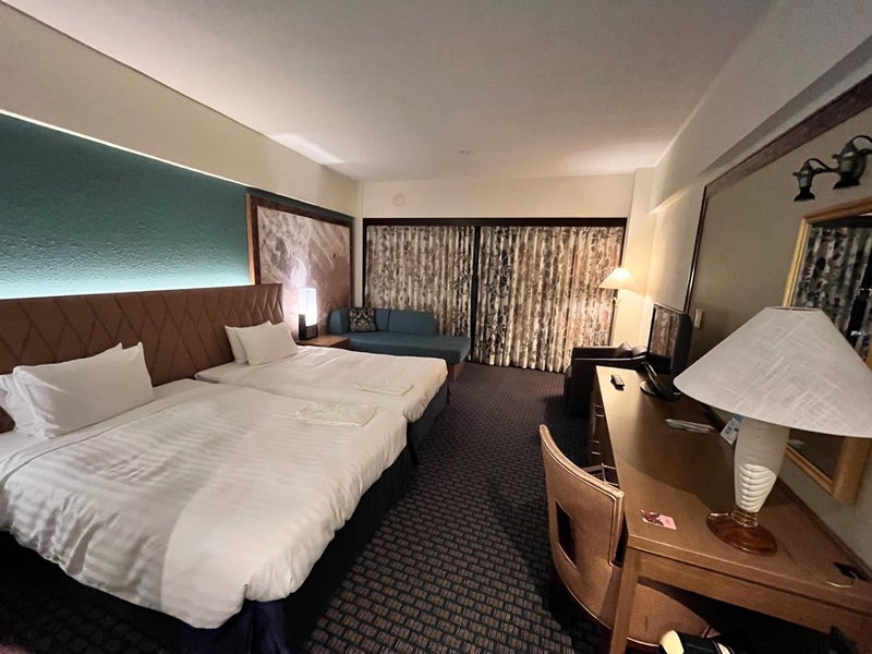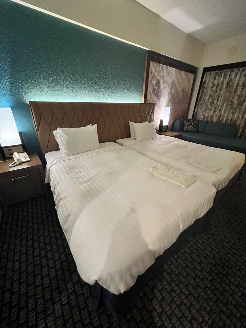 ↑ベッドが2台あり、その奥にソファーがあります。部屋自体もベッドも広かったです。