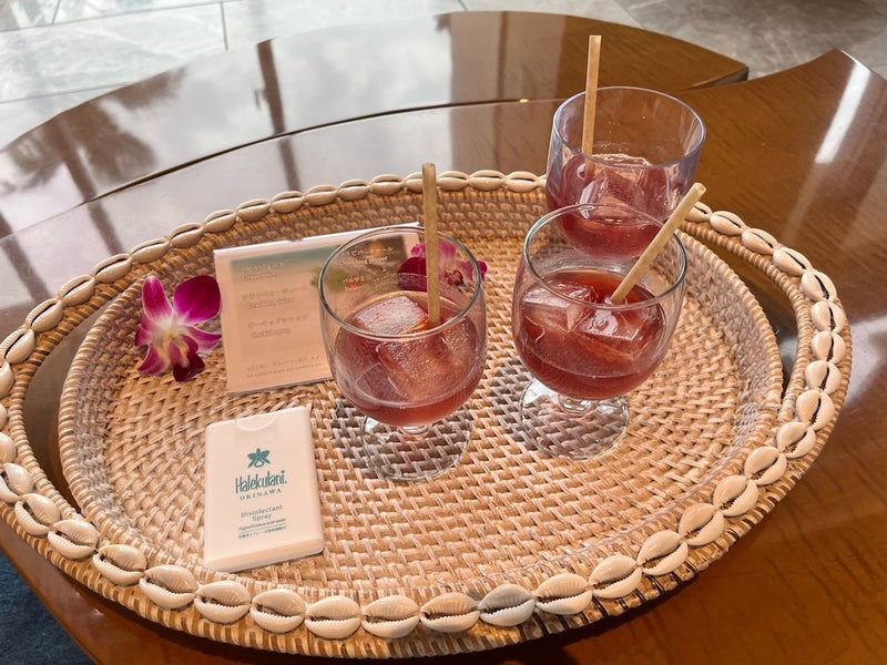 ↑チェックイン時にウェルカムドリンクと除菌用スプレーを頂きました。