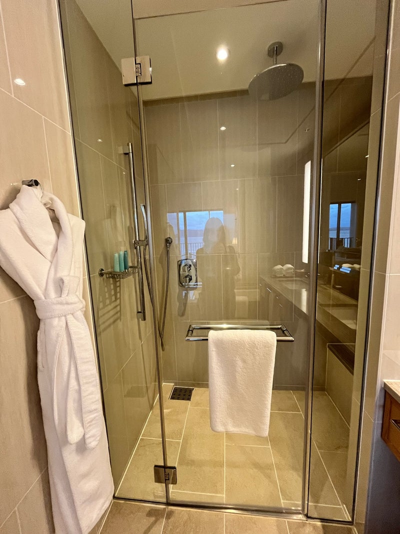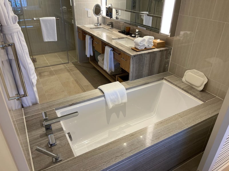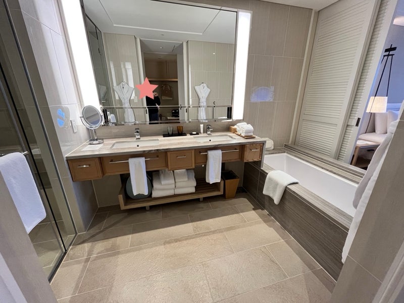 ↑入って左手に洗面所、浴室、シャワールームがあります。非常に広々としていました。タオルもふっかふか~!!バスタオル、12,000円で販売されています。そりゃふっかふかだわ。