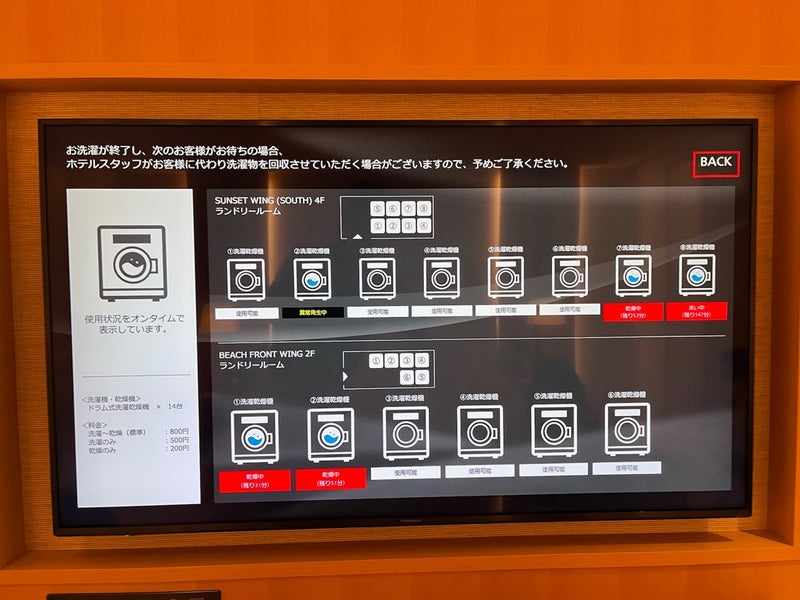 ↑部屋のテレビからランドリールームの使用状況を確認することができました。私が見た限りフル稼働している時はありませんでした。夏は違うかも?