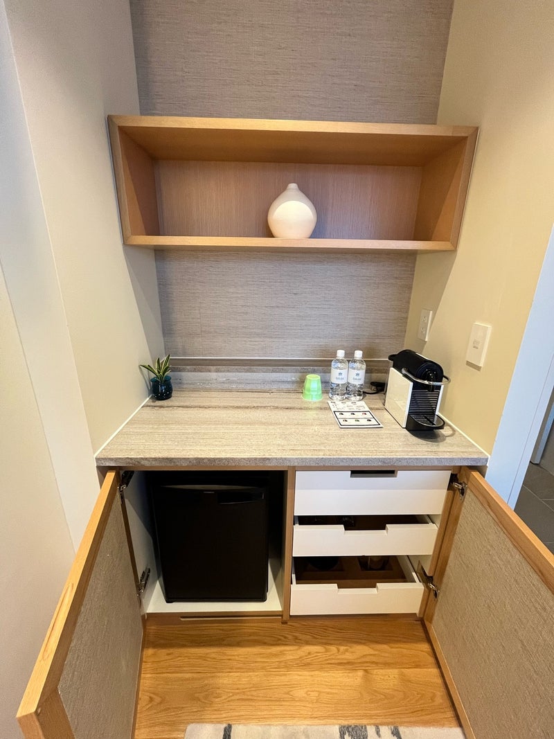 ↑バーエリア。お水とネスプレッソが置いてありました。下には冷蔵庫がありました。