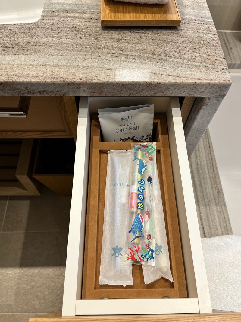 ↑洗面台の中にはアメニティが入っていて、子ども用の歯ブラシも置いてありました。