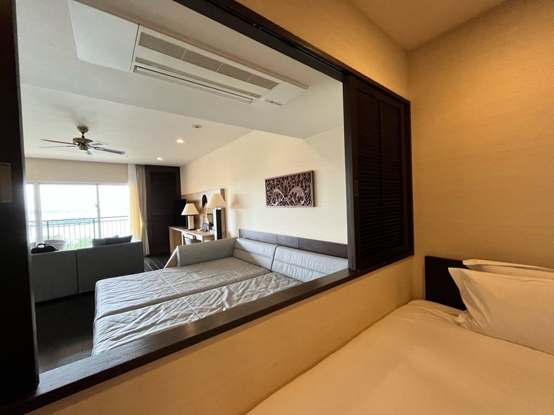 ↑寝室。ベッドも広々で余裕で3人寝ることができました。寝室の扉とカーテンを閉めれば、ほぼ真っ暗でした。