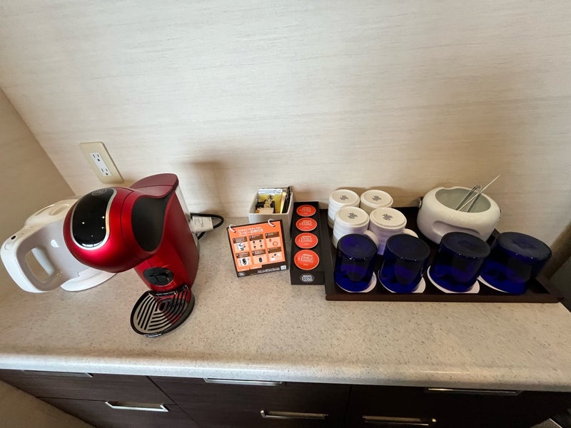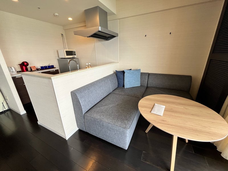 ↑キッチンにはさんぴん茶のパックやネスプレッソが置いてありました。お水も毎日2本ずつ補充されていました。