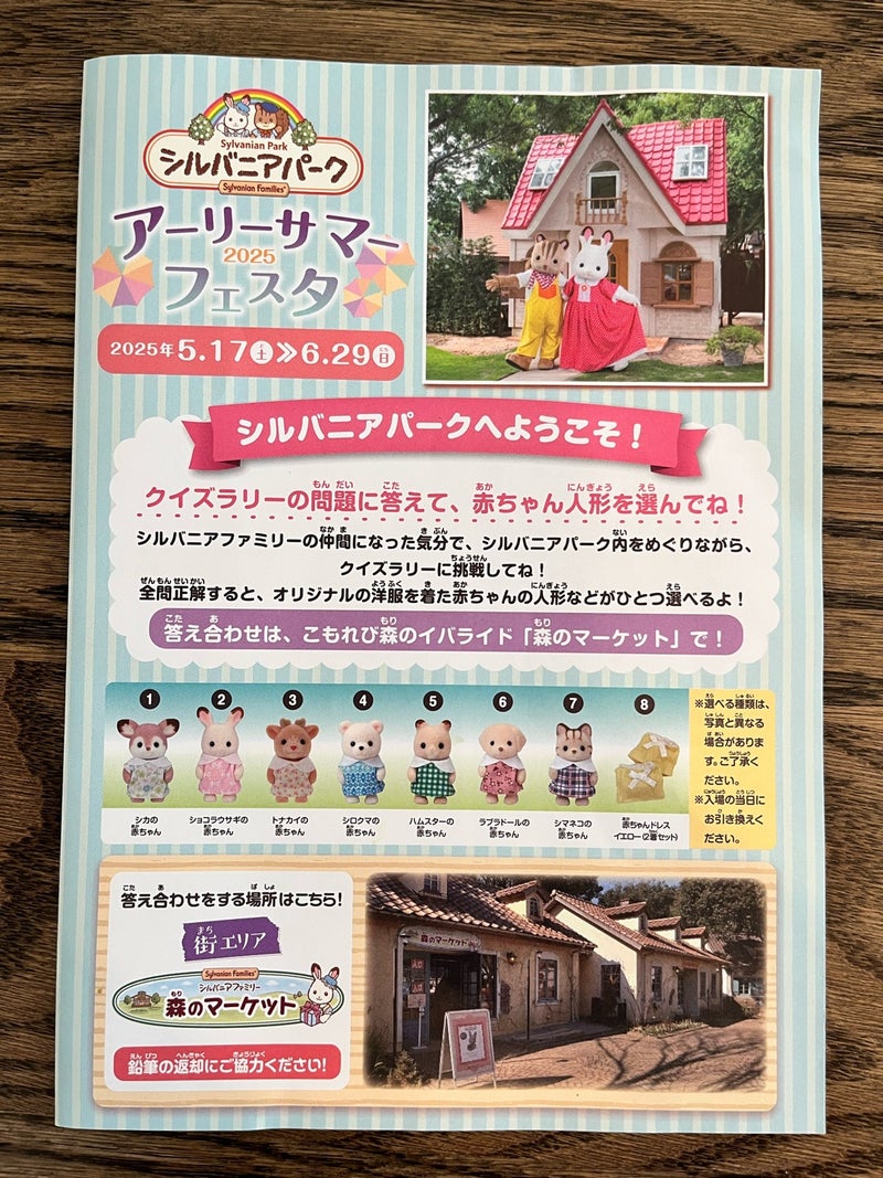 シルバニアパークは別料金で、ひとり700円(2歳以下無料)です。(HPによると、7月1日から800円へ値上がりするそうです)入る前にクイズラリーの用紙をもらい、そのクイズに全問正解すると赤ちゃん人形がもらえます。その人形がもらえるなら、この入場料も妥当かなと思います。